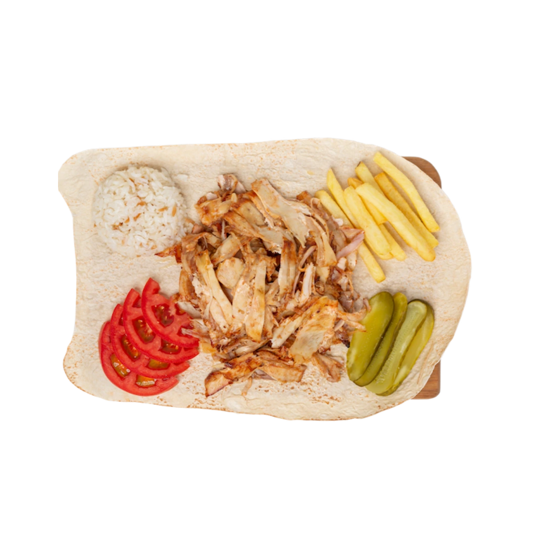 Tavuk Döner, Pilav, Patates kızartması, Domates ve Turşu ile Servis Edilir.
